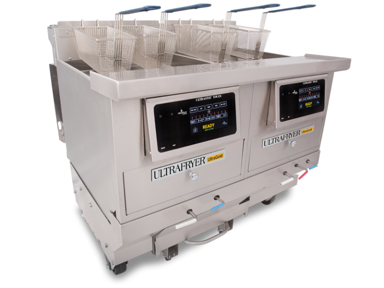 The UltraGold Right Size two vat deep fryer battery features dual infrared burners paired with a phased array heat exchanger, thermostat controls and UltraClear Plus filtration. Our UltraStat® 402 touchscreen controls are available as an option.